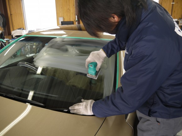 窓ガラスはガラスコーティングを施すので専用のミニサンダーで丁寧に磨きました