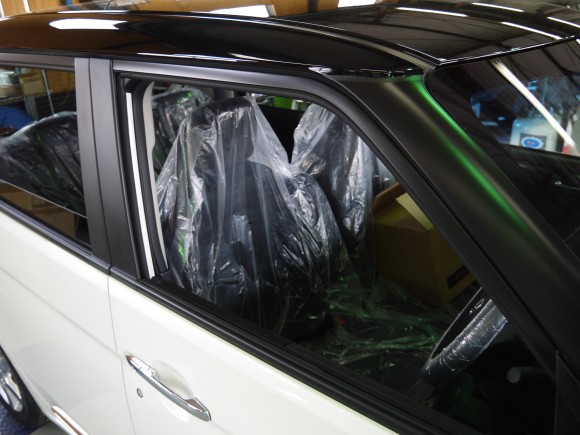 下処理後、結晶化ガラスを塗装面に張り付けて行きます