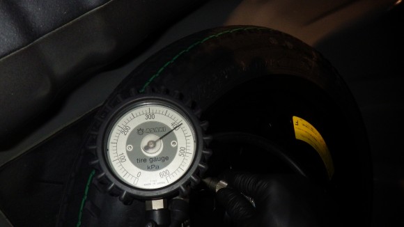 タイヤの空気圧調整です。これはスペアタイヤです。適性値に調整しています。