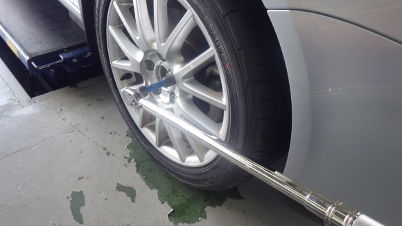 タイヤを取り付けてトルクレンチで締め付けしています。