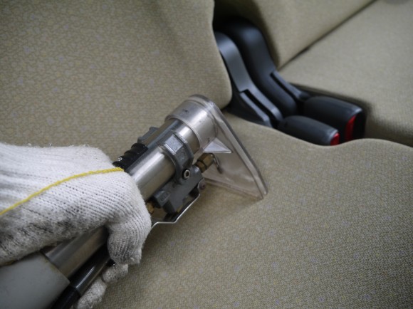 シミ抜き用洗剤を噴霧した後、高温スチームと掃除機が合体した専用の機械で