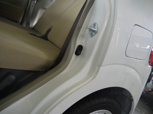 ドアモールのゴムがステップやピラーに付着し汚れたように見せています