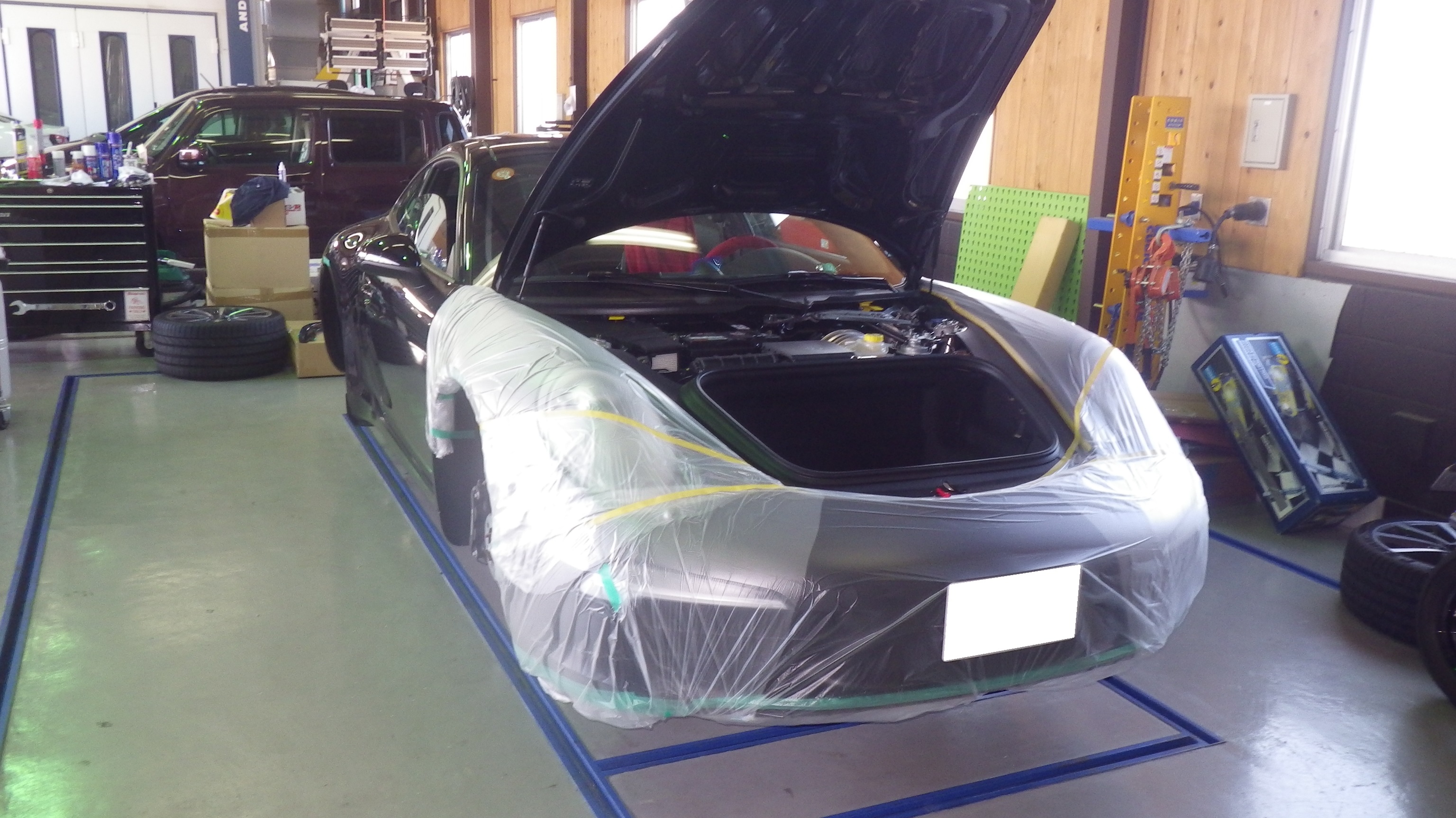 作業前の準備としましてボディーへの傷つき防止作業を実施しております。