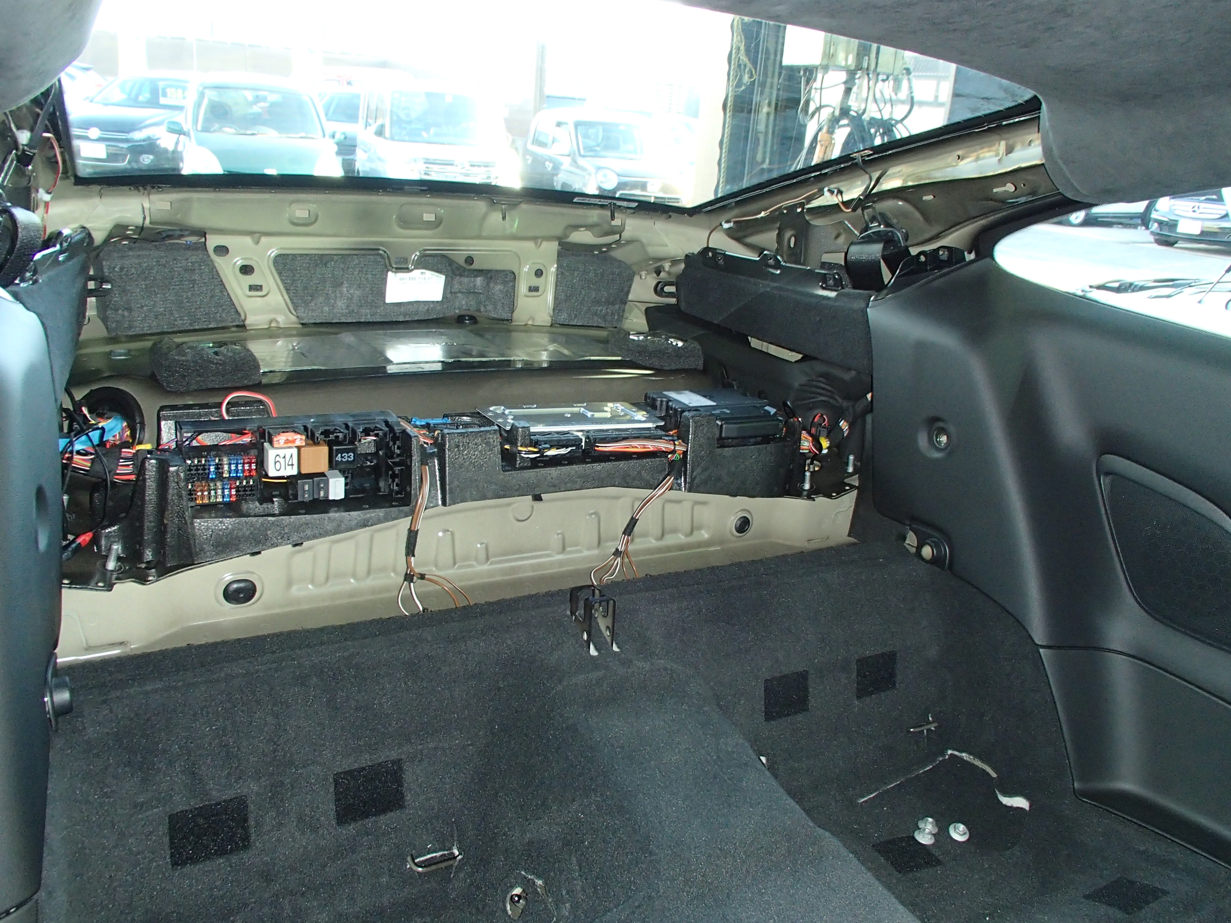 リヤはサスペンションの上部が室内側から固定されていますので、室内の部品を取り外していきます。