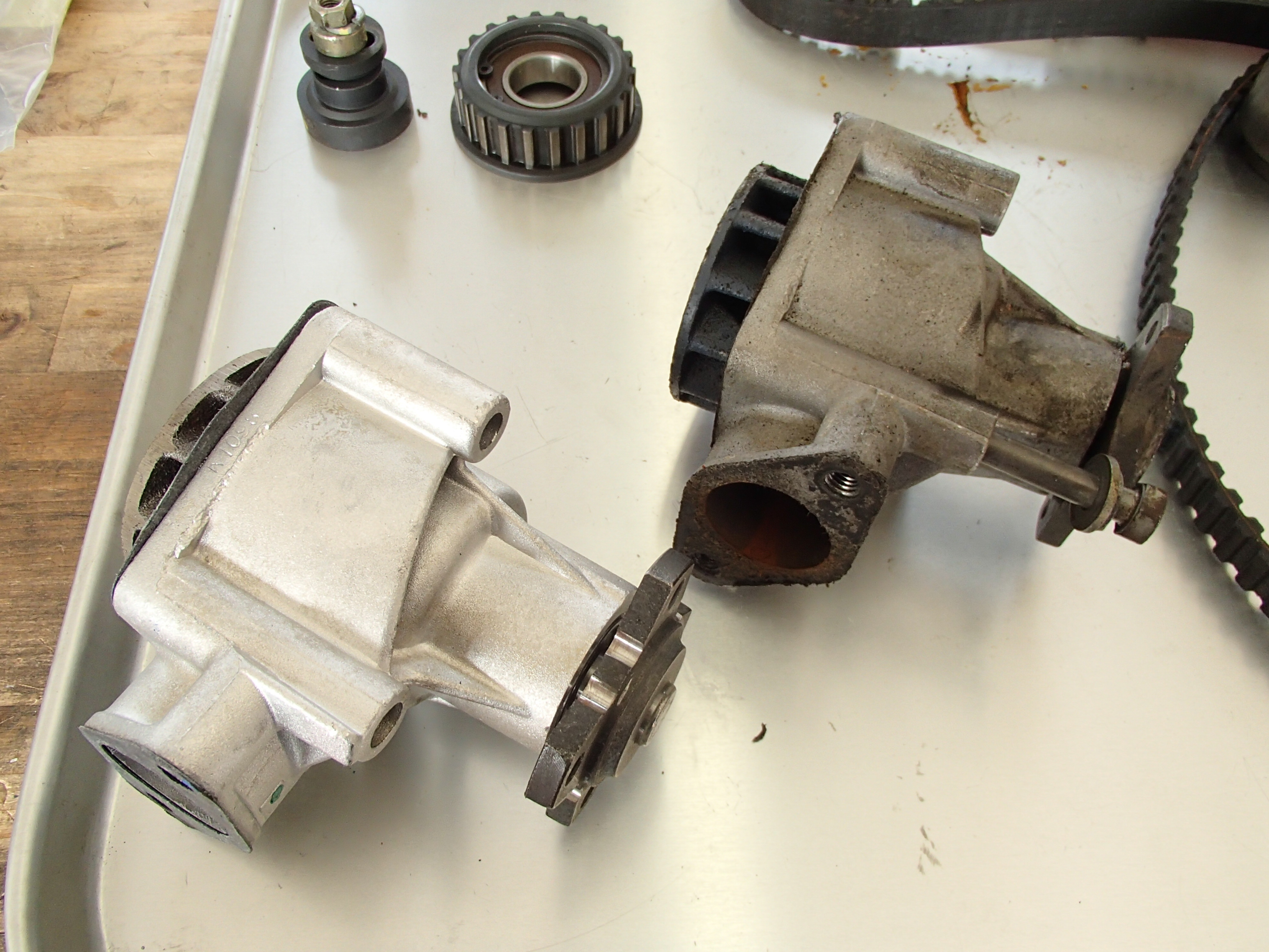 左が新品のウォータポンプ、右が車両に取り付けられていたものです。