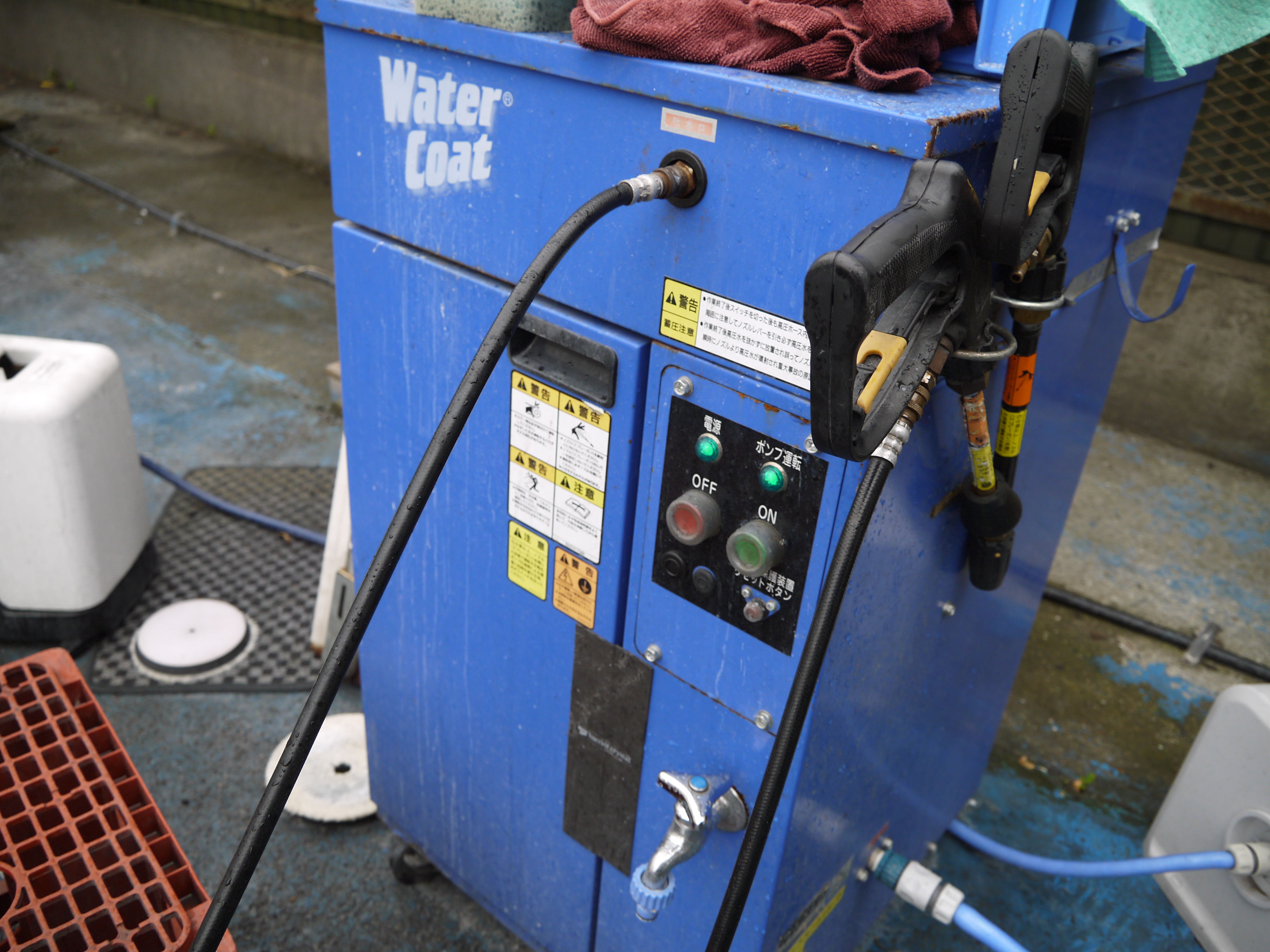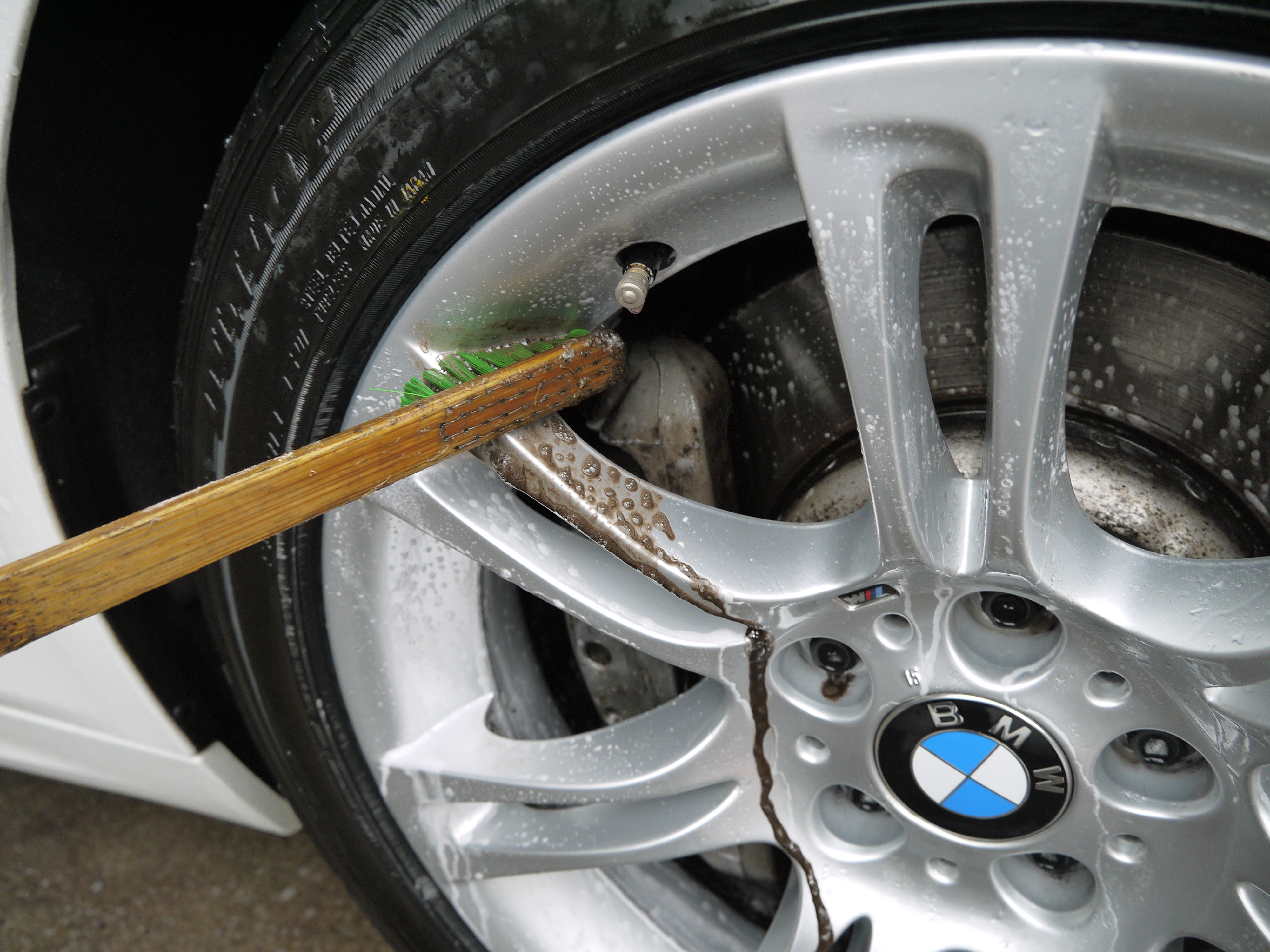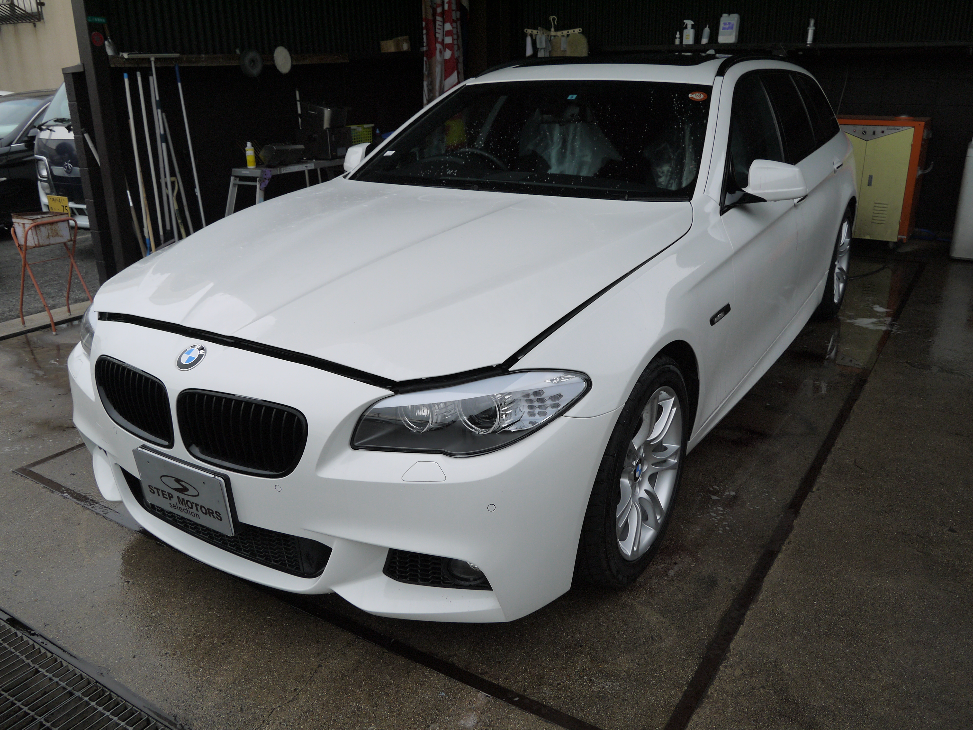 平成23年式 BMW 535i Mスポーツ 清掃・仕上げ! CH2499 2014/06/03/0 コメント/カテゴリ: コーティング・清掃 /作成者: takagiSTEP MOTORS selection BMW 525iの清掃・仕上げを行いました まず、アルミホイールの汚れを除去し ボディ塗装面の汚れを高圧洗浄機で飛ばしてから モッコモコシャンプーで洗い流しました 次に、鉄粉を除去して外装磨き下地を作りました 紫色に変色しているのが鉄粉です 乾燥後、ポリッシャを使用して外装塗装面を磨いていきます ポリッシャが入らない所は手作業で磨き仕上げました AFTER 磨き後の状態です 艶が引き出されて美しい塗装面になりましたね 外装磨き後、内装の清掃を行いました 清掃後、ガラスコーティングWater Coatを施す準備をします BEFORE 水をかけると・・・ コンパウンドに含まれる微量の油分が水を弾いています このままコーティングしても被膜が張り付かず不安定になります 塗装面に張り付いた油分を分解・除去します AFTER 分解・除去後、水が塗装面に張り付く状態になりました この状態になれば被膜が張り付き易く強度も上がります 油分除去後、Water Coatを施します 結晶化ガラスを塗装面に張り付ける事で 被膜を形成し親水性のガラス結晶体となります アルミホイールにも張り付ける事で 防汚性に優れ汚れを落ちやすくしてくれます 初期施工になるので BASE UP PROで被膜が安定するまでの犠牲塗膜を作りました 最後に広角ノズルで仕上げてWater Coat施工完了です 以上が清掃・仕上げ作業内容です STEP MOTORS selection 清掃・仕上げ担当 高木 大地