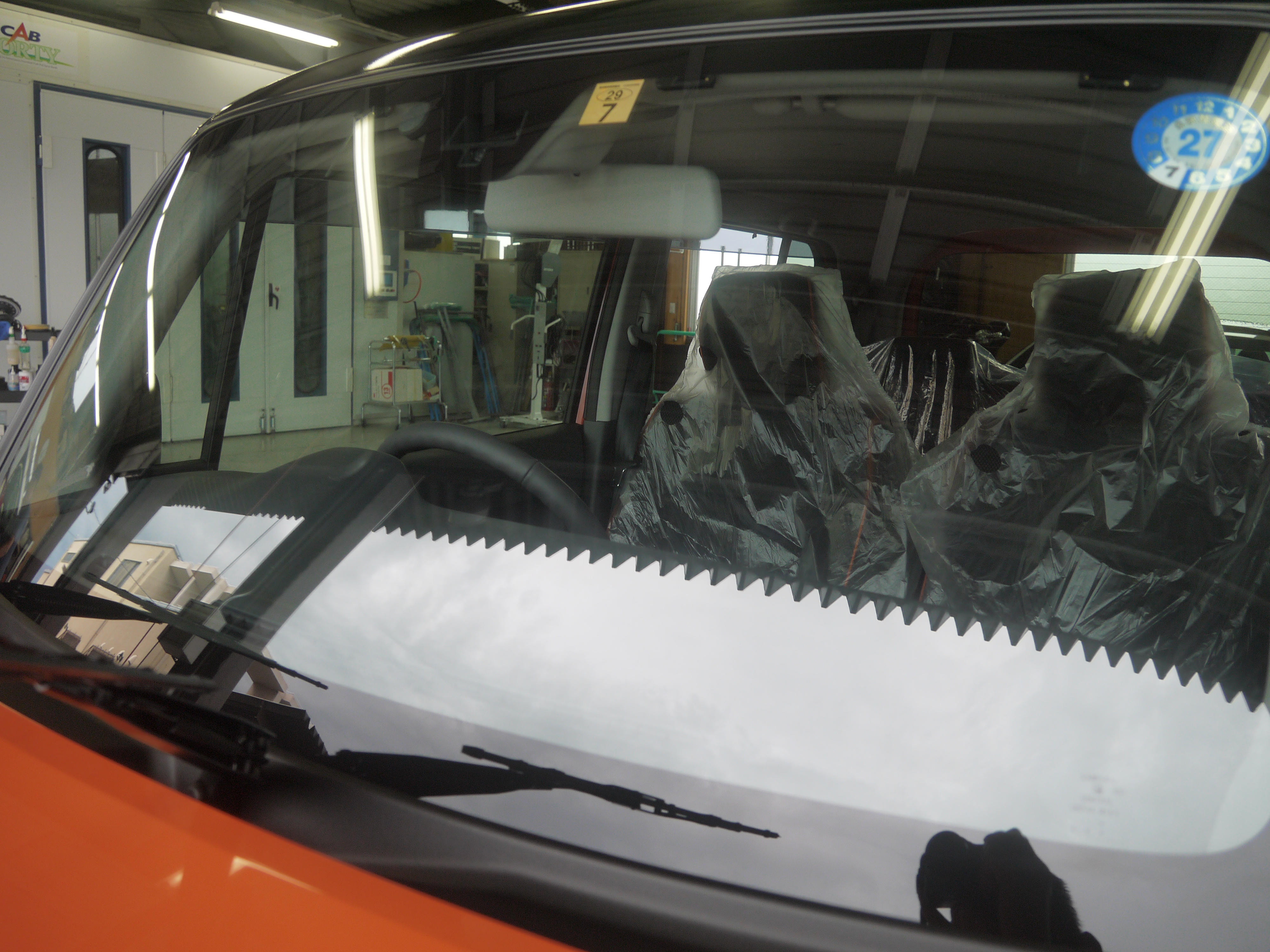 新車 スズキ ハスラー X ターボ 4WD Glass Coating DIAMOND COAT FLASH / G’zox Hyper View 施工! CH2357 2014/08/09/0 コメント/カテゴリ: コーティング・清掃 /作成者: takagiSTEP MOTORS selection スズキ ハスラーにガラスコーティングを施しました まずは下地作りです 高圧高温洗浄機で塗装面に付着した汚れを洗い飛ばし 次にシャンプーで汚れを包み込み洗浄しました シャンプー後、塗装面に張り付いた鉄粉を除去します 使用するのはWAKOS製ラストリムーバーです 塗布する事で鉄粉が紫に変色し溶けて流れ落ちます 昔はトラップ粘土が主流でしたが 粘土では塗装面を傷つけてしまう為 高価ですが自社ではラストリムーバーを使用します 次に窓ガラスの下地を作ります 専用の研磨剤とスポンジを使用します BEFORE 研磨前の状態です 水が弾かれている部分がありますね このままでは撥水コートしても すぐに剥がれ落ちてしまいます 実はこの状態になる事がウロコの原因となります (水玉状の跡) AFTER 研磨後の状態です 水がガラスに張り付き流れ落ちて行きます この状態になれば撥水剤が張り付き易くなり 撥水効果が長持ちします ガラス面と同じように塗装面の脱脂を行います BEFORE 脱脂前の状態です 同じように水が弾かれています AFTER 脱脂後の状態です 脱脂後の塗装面は水が張り付き動きません この状態になればコーティングが張り付き易く 被膜形成後、安定し強度も増します 下地処理後、十分に乾燥させます ガラスコーティングは被膜が安定する前に水に触れてしまうと 分解する性質があるからです 乾燥中、先にバイザーを取り付けました AFTER 取り付け後の状態です 乾燥も終わりガラスコーティングを施します! フロントガラス用ガラスコーティング ハイパービューです 乾燥したフロントガラスに定着安定剤を塗布します 塗布する事で撥水の層がガラス面に張り付く状態になります 塗布後10分乾燥させます 次に撥水剤を塗布します ビンの中に窒素ガスが封入されており 酸素に触れる事で被膜を形成します その為、使い回しが出来ない1本使い切りです 塗布後さらに10分乾燥させ 最後に拭き残しがないように拭き上げて完了です 今回はフロントガラスと 運転席・助手席側のガラス面に撥水剤を塗布してあります 長期間撥水する効果をご堪能下さいね ボディ塗装面用ガラスコーティング剤 DIAMOND COAT FLASHです パネル1枚ごと丁寧に塗布していきます 乾燥後、何度も確認しながら丁寧に拭き上げ仕上げます 先に取り付けたバイザーにも 同じDIAMOND COAT FLASHを塗布してあります AFTER 施工後のボンネットです ガラス特有の艶出し効果が加わりより美しくなりました! カッティングシートで製作した ルーフにも同じコーティングを施し保護しています 側面も綺麗に仕上がりました 最後の仕上げに G’zox タイヤコートをタイヤに塗布しました 従来品では油性は持続力がありますがタイヤを傷めてしまい 水性ではタイヤに優しいですが雨に弱く持続力が悪いです タイヤコートはタイヤ専用のコーティング剤で タイヤを保護しつつ長期間艶を維持します 以上が新車のガラスコーティング DIAMOND COAT FLASH G’zox ハイパービュー 施工内容です STEP MOTORS selection 清掃・仕上げ担当 髙木 大地