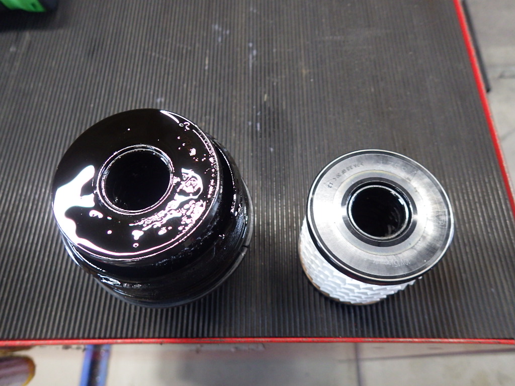 左側が交換前のオイルフィルター、右側が新品のオイルフィルターになります。