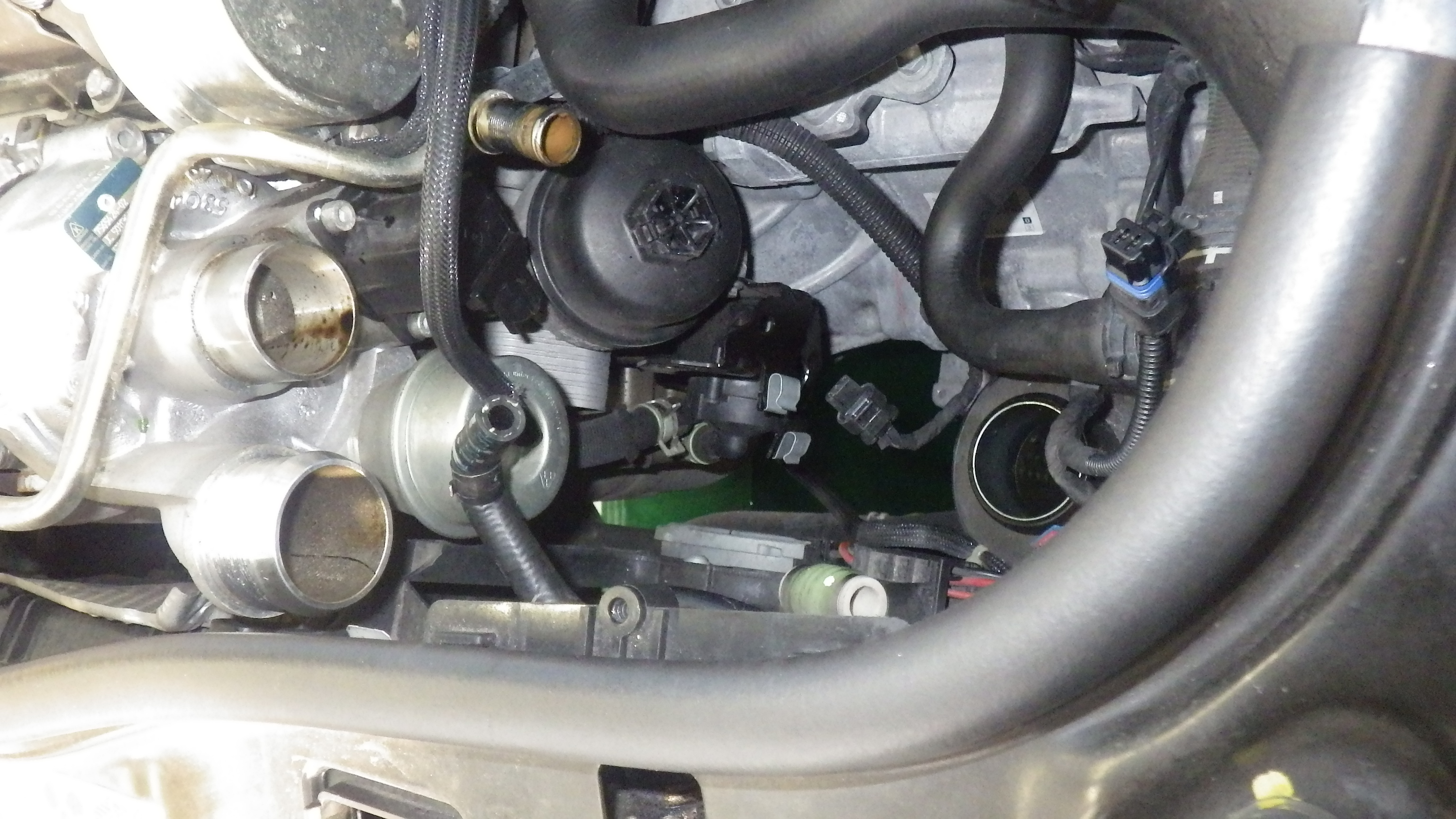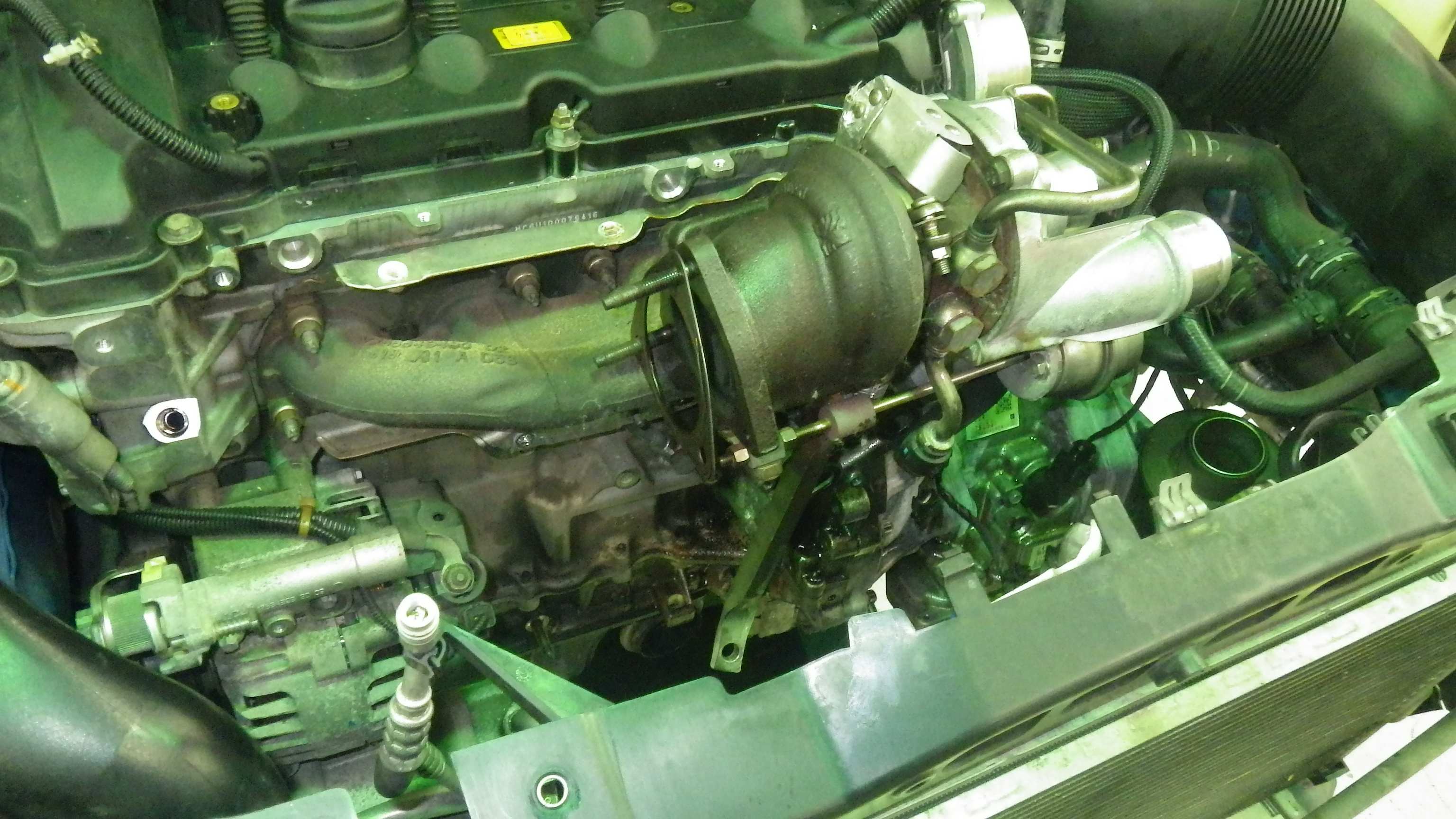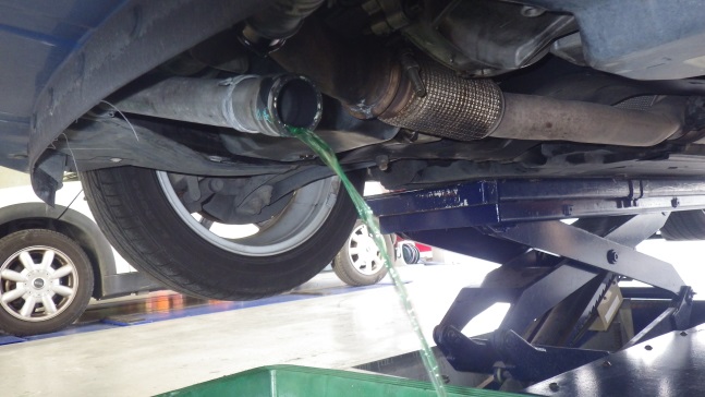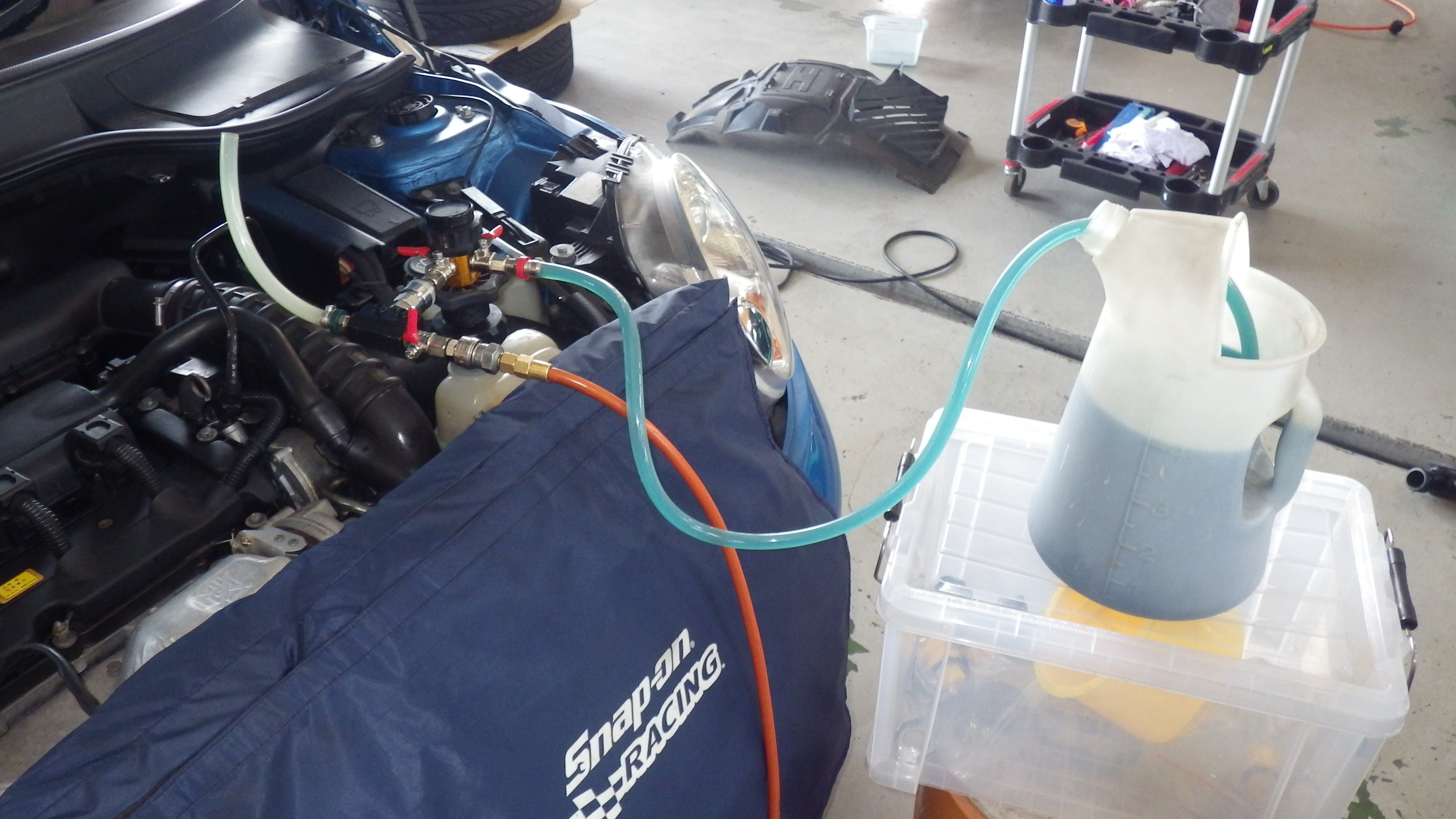 交換後すべての部品を組付け、エンジンオイル、クーラントを補充しています。