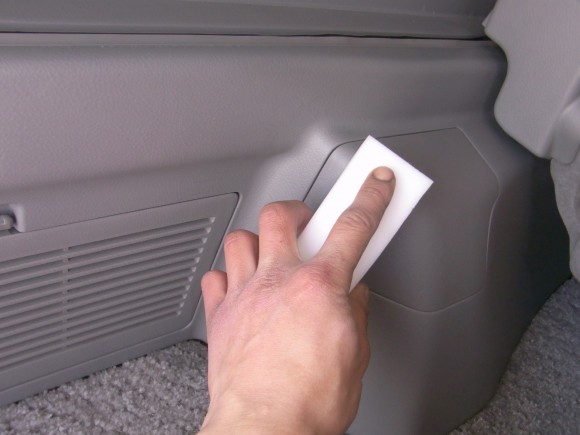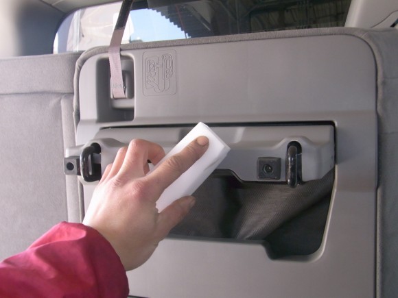 内装では、内張りなどをメラニンスポンジと内装用ケミカルで磨いていきます (^^)/
