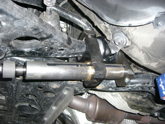 ロアアームブッシュはスペシャルツールで、サブフレームに圧入。