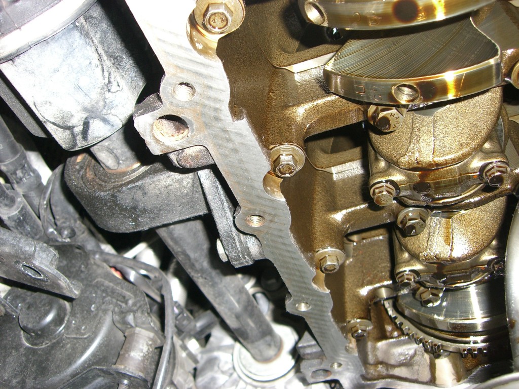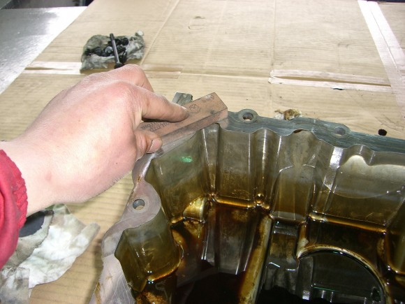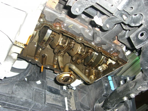 お次はエンジン下部オイル漏れの修理です。オイルパンを取り外し、