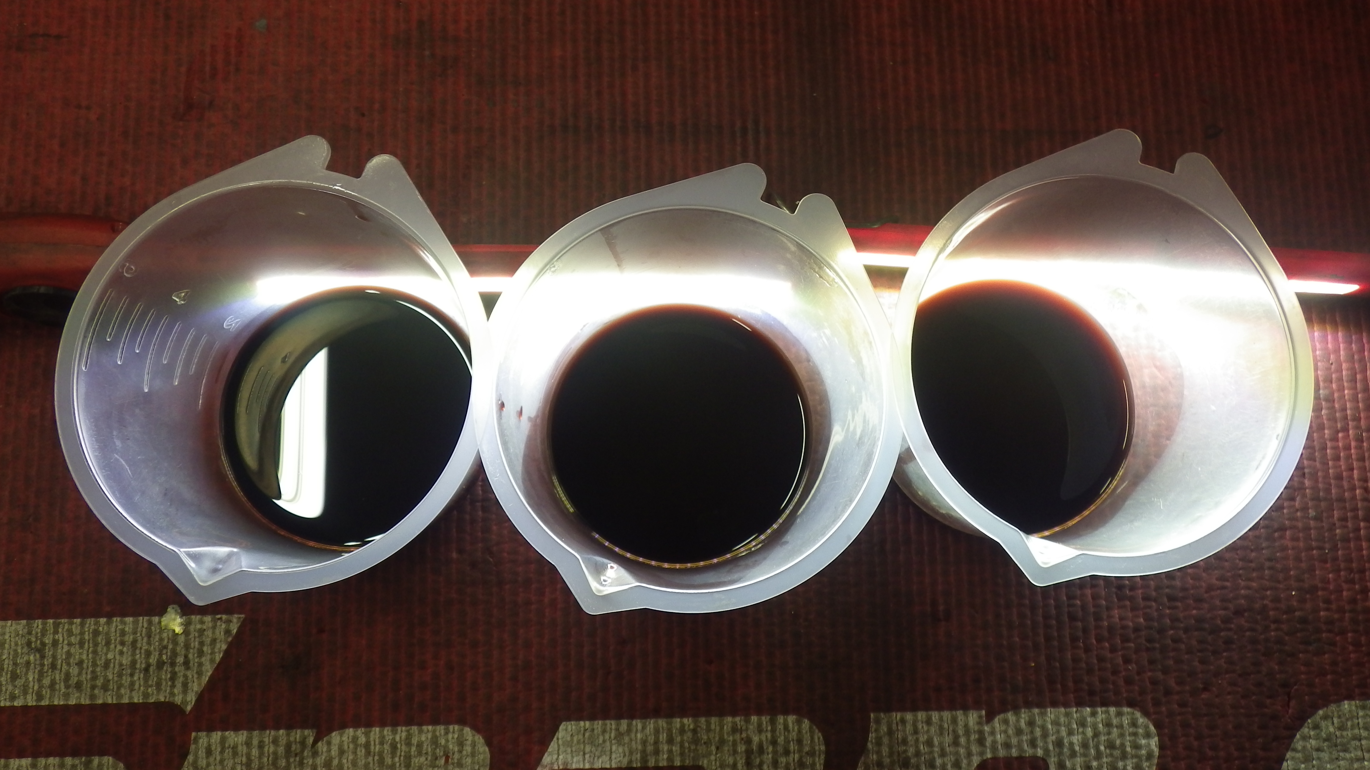 交換前、交換後のオイルです。交換後オイル量の点検も実施しています。